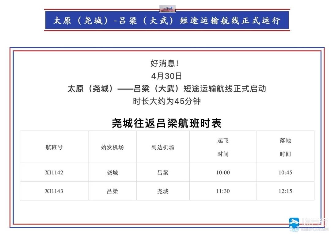 航線運營公司為新疆通航,選用大棕熊100型飛機執飛,該機型可售座位為7座。呂梁至太原的機票28元起。
