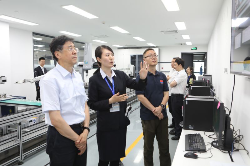 殷衛寧在虛擬仿真平臺體驗了VR技術在工藝、土建等多專業中的實際應用,系統了解了生產線三維設計、仿真優化、建造的全流程,并就VR技術的應用前景與研發人員進行了討論。在生產現場,殷衛寧體驗了產品定制化生產的全過程,并就模型線所體現的智能制造核心技術與研發人員進行了討論。