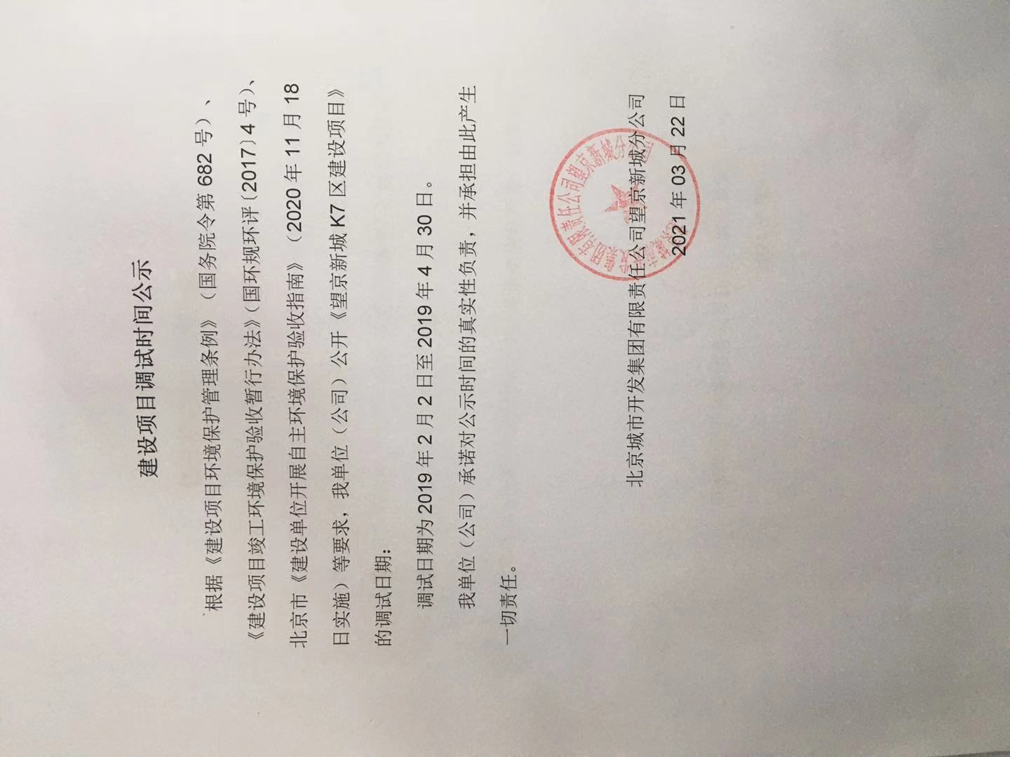 關于北京城市開發集團有限責任公司望京新城分公司《望京新城K7區建設項目》調試時間的公示